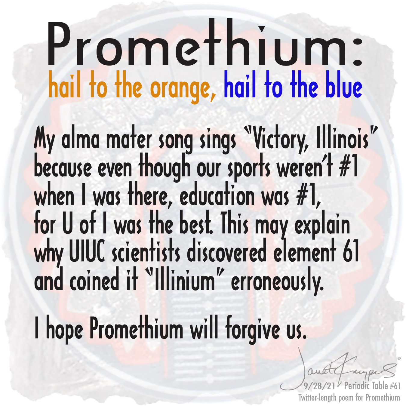 Enjoy this YouTube video of Janet Kuypers reading her poems “Cerium-141, slowly seeping in” (+ showing its image), “Praseodymium: up close and personal” (+ showing its image), “Praseodymium: toxic if you breathe it...” (+ showing its image), “Neodymium saved from e-waste” (+ showing its image), and“Promethium: hail to the orange, hail to the blue” (+ showing its image) from the books “Unable To Escape It” and “Twitter Verse Periodic Table Poetry” for the 4/5/23 ‘Community Poetry’ honorary book reading (from a Panasonic Lumix 2500 camera; on Facebook, Twitter, Linkedin, pinterest, Instagram,