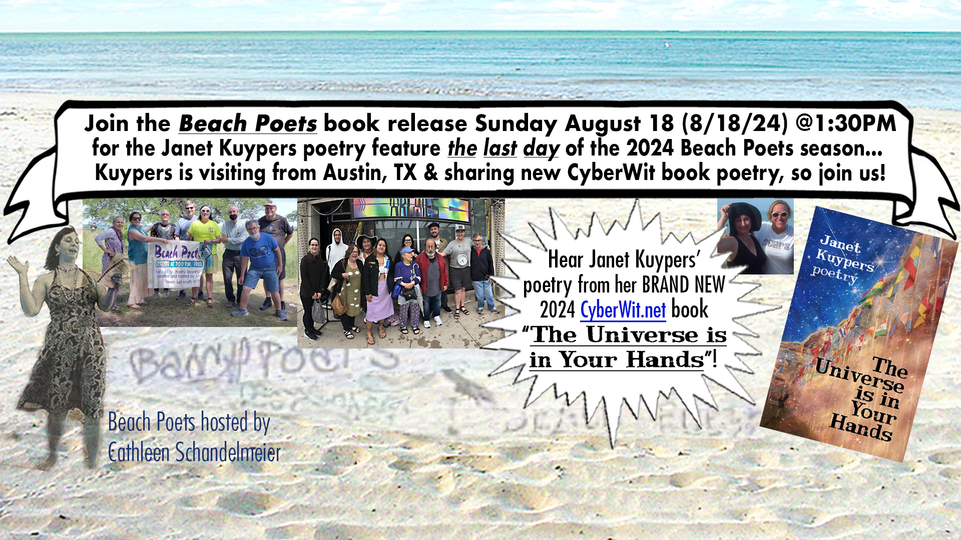 Chicago poet and Austin resident Janet Kuypers returned to Chicago in the middle of August in 2024, and was honored with her final performance in her 2024 poetry book tour for the CyberWit 2024 Janet Kuypers book “The Universe is in Your Hands” as a feature in the 2024 final’ poetry get-together for the Beach Poets and Janet Kuypers feature on 8/18/24 at Leone Beach at Loyola Park (Greenleaf and the lake, just east of Sheridan Road and 4 blocks north of the Loyola L stop).