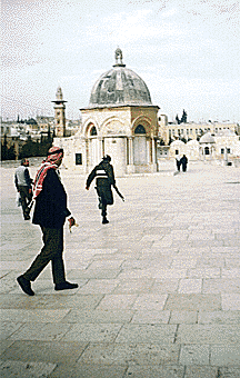 I went back to the Old City to get some Jordanian dinars. I also bought a kaffiyah. I had lost my beautiful Mexican scarf somewhere between Bratislava and Budapest. I was kinda hip to hit the holy sights. So I started with the Church of the Holy Sepulcher. It was dank and crowded. Whether Jesus really died here wasn't all that clear. The sweet smell of incense coated the Crusader walls of the church. Priest gangs fought for turf inside the sacred compartment; and gluttonous crowds lined up for a poke into "The Place" of impoverished crucifixion. It was all good fun. I escaped the crowds and lost myself inside the narrow alleys and secret tunnels of the Old City. I loved this.