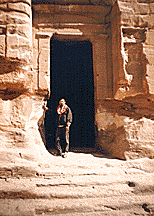 I spent the night in a comfortable hotel and almost didn't return to the ruins the next morning. A blinding windstorm hit the entire area with its frightening hints of violent doom; the wrathful holocaust ended almost as soon as it began. I taxied back down to the entrance of the complex and didn't really know what to see with the few remaining hours left to me. The bus would be heading back to Amman in the late afternoon. A young Arab who snapped my photo told me to go up to the Altar of High Sacrifice. I did so and the energies were powerful and awesome. I grunted and sweated up the steep trail, climbing higher and higher, and stopping occasionally to gaze at the vast and unfolding panorama that was Petra. I could see donkeys trailing their way below, looking as small as ants. A young Dutch mother and her two daughters had decided to take a rest slightly up ahead of me. I was dizzy and the blonde little Dutch girls were transformed into angels by my fatigued eyes. I could feel a heavy vibration in this rarefied atmosphere. It was indeed the vibration of SACRIFICE.