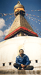It was Losar, the Tibetan new year. In Bodnath, I gave Annika and Nick a tour of the great stupa. Countless pilgrims were pinwheeling around the stupa's many levels in a mad traffic of confused celebration. "Oh, it's so much better here," Pia commented, with a tinge of relief. "These people are very nice." We boarded the bus to Kathmandu. Pia kept talking non-stop like an endlessly running motor. Pia's enthusiasm never seemed to flag, but Nick looked exhausted. "She's not very deep," he volunteered. When we hopped out, an unknown Nepali attempted to lift Nick's wallet, but Nick's ever-present vigilance prevented a minor tragedy. I could sense Vajrayogini watching us. Someone stepped on Pia's skirt, ripping it as she attempted to get off the bus. Her long white legs were now exposed to the cold night air. I kissed Pia good-bye. "You know, I saw little skulls in your eyes up there," Pia confided in me. She kissed me on the lips and disappeared into the unfriendly streets. I felt totally relieved.