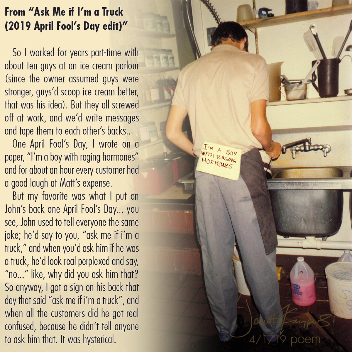 See YouTube video of Janet Kuypers reading her poems “Ask Me if I’m a Truck (2019 April Fool’s Edit)” for April Fool’s Day on April 1st, “Zynski’s Manifesto” for the day the Unabomber was arrested on April 3rd , and “Journalists Revealing the World” for Hug a Newsperson day on April 4th , April event poems read from her poetry book “Every Event of the Year (Volume one: January-June)” during her “Poetic License open mic 4/5/20 home edition” she hosted in Austin, but globally through a Facebook event page (this video was filmed from a Panasonic Lumix 2500 camera, and also posted on Facebook, Twitter, Pinterest, Instagram and Tumblr). |